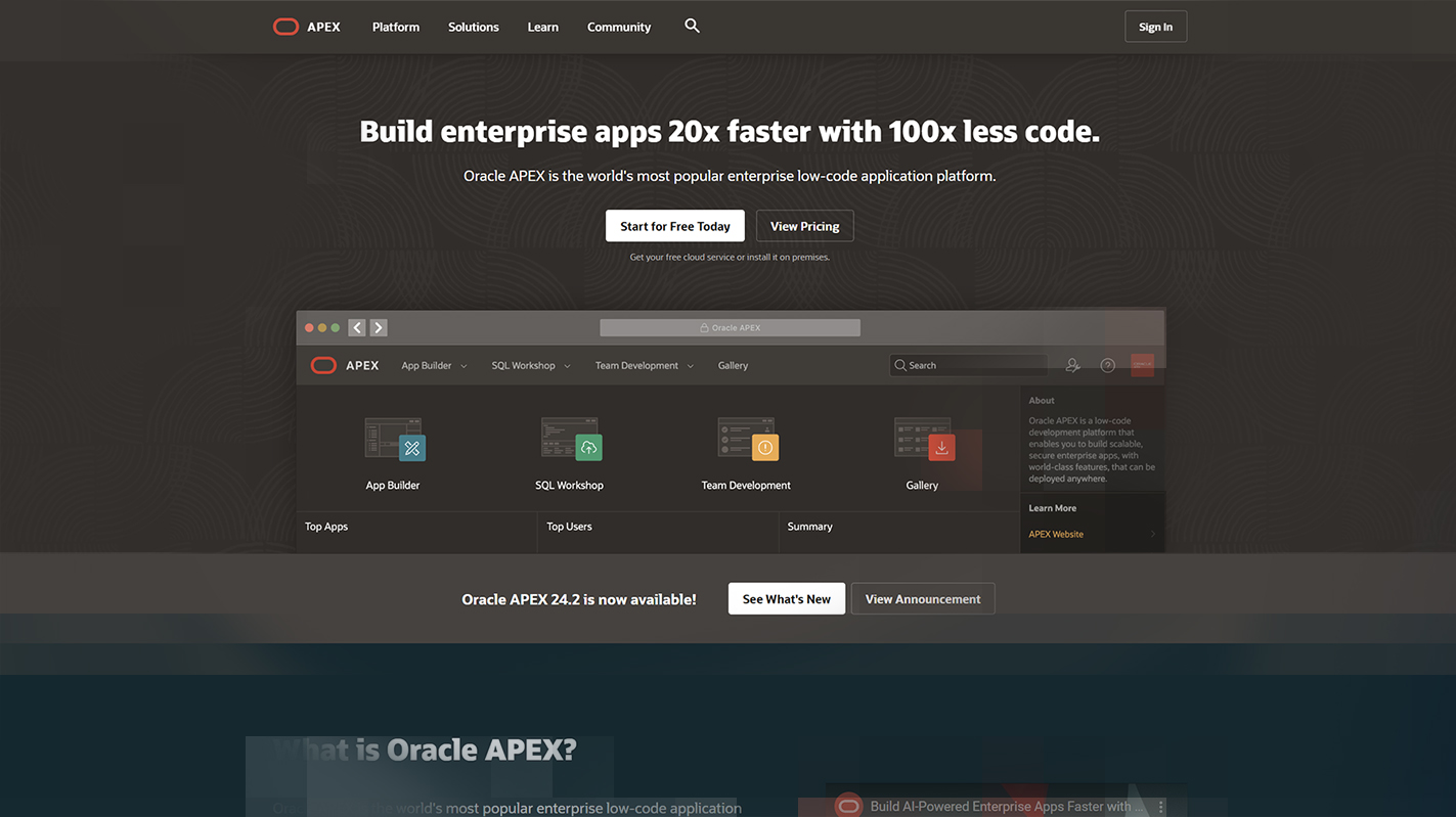 Erstellen Sie Unternehmensanwendungen 20 mal schneller und mit 100 mal weniger Code! Entdecken Sie Oracle APEX - die weltweit beliebteste Low-Code-Plattform für Unternehmensanwendungen.